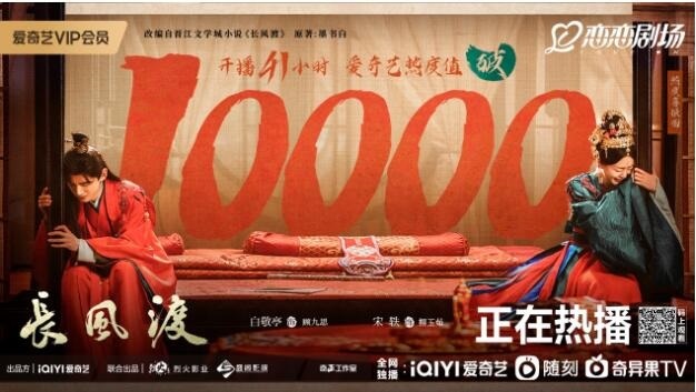 6月21日,记者从爱奇艺了解到,恋恋剧场热播古装大剧《长风渡》于6月20日在爱奇艺内容热度峰值突破10000,成为站内历史热度最快破万的剧集,也是今年继《狂飙》后,爱奇艺第二部热度破万的作品,提前点燃暑期档。