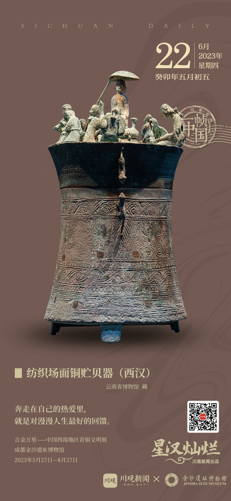 铜贮贝器是古代滇人特有的用以存放货贝并具有一定政治和宗教意义的青铜器皿,1992年出土于云南玉溪江川李家山墓地的纺织场面铜贮贝器就是这样一件。同大量出土于云南地区的青铜器一样,纺织场面铜贮贝器的器盖铸造了一幅颇具写实风格的纺织场景。由于目前史料方面关于滇国的记载非常少,这些青铜器就成为了我们想象2000年前滇国生活、战争和劳动场景的重要材料。