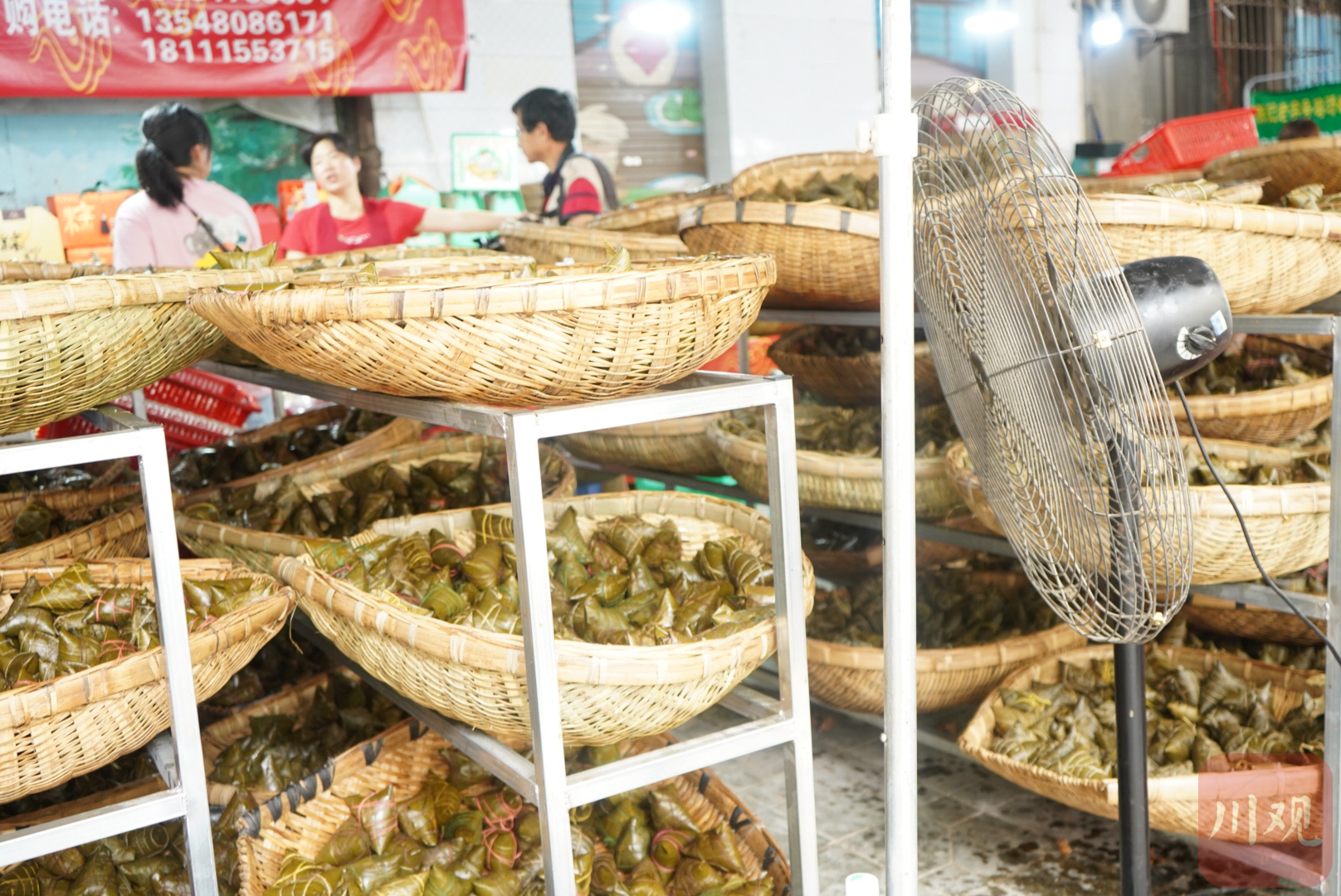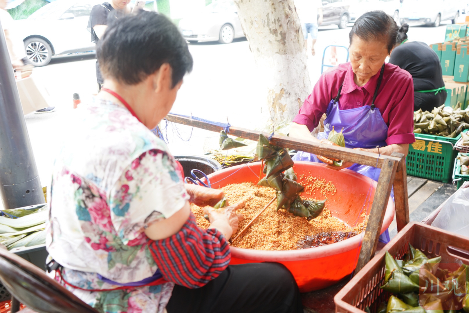 6月20日上午9点过,成都市金牛区马鞍东路“粽子一条街”人声鼎沸。穿过这条街,粽香一路扑面而来,商家们用铁盆装着颜色不一的馅料,有鲜嫩多汁的酱色卤肉馅,有酒红色的豆沙馅……不过,各家忙碌的节奏不一,有的洗粽叶,有的用风扇给粽子散热,有的用彩色丝线捆粽子,还有的在抽真空包装和打包送货……