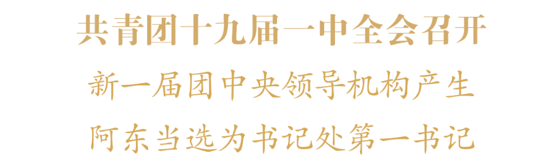 全会选举阿东为团十九届中央书记处第一书记,徐晓、王艺、胡百精、胡盛(挂职)、夏帕克提·吾守尔(挂职)、余静(兼职)为书记处书记。