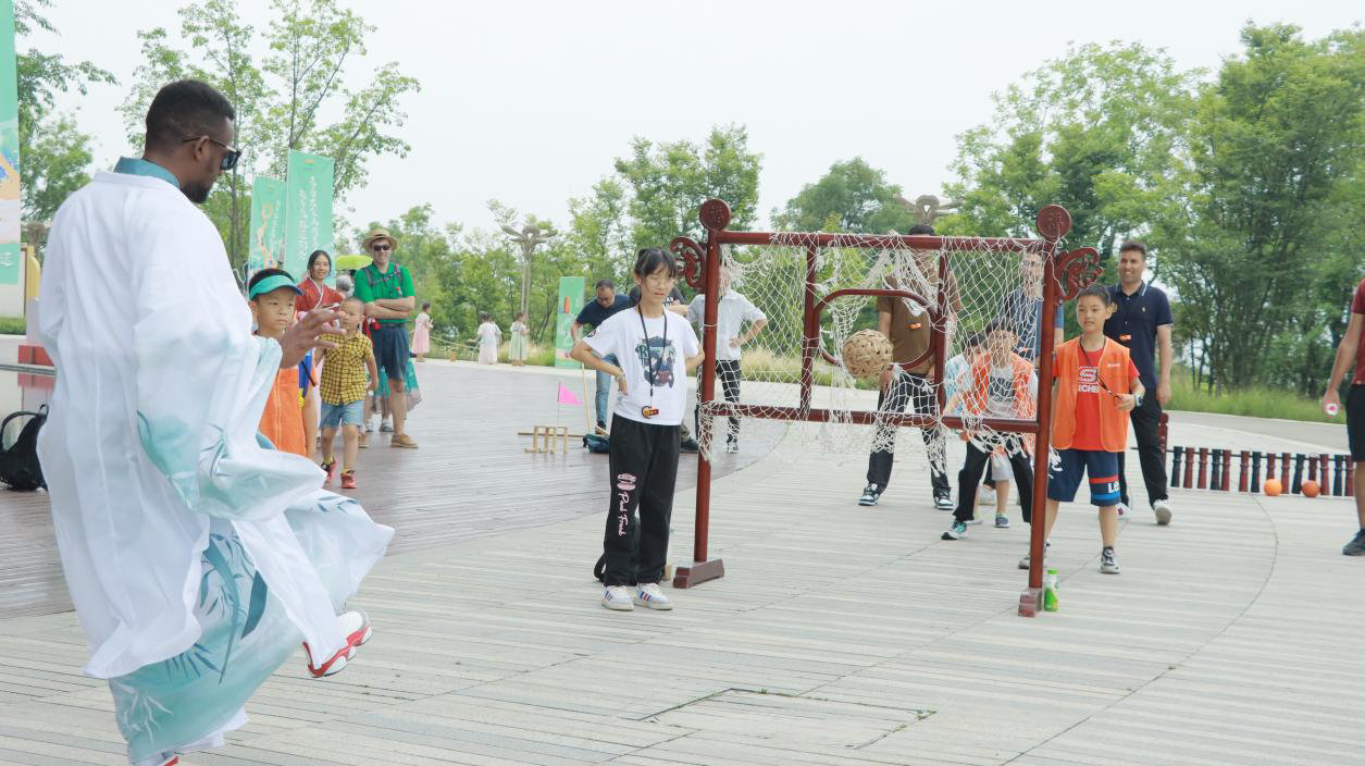 本次丹景台端午汉服运动会设置了蹴鞠、投壶、捶丸、木射、射箭、滚铁环古代运动项目,受到了众多景区游客的欢迎,活动现场争相进行体验。