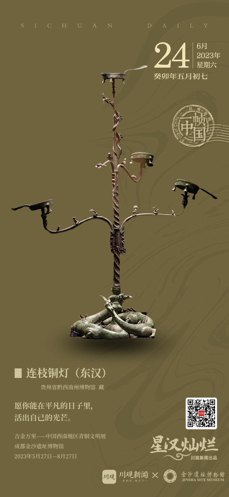 连枝铜灯1987年出土于贵州省兴仁县雨樟镇交乐6号墓,是一件东汉时期的文物,现由贵州省黔西南州博物馆收藏。灯呈树状,由灯座、灯柱、灯枝和灯盘几部分组成。
