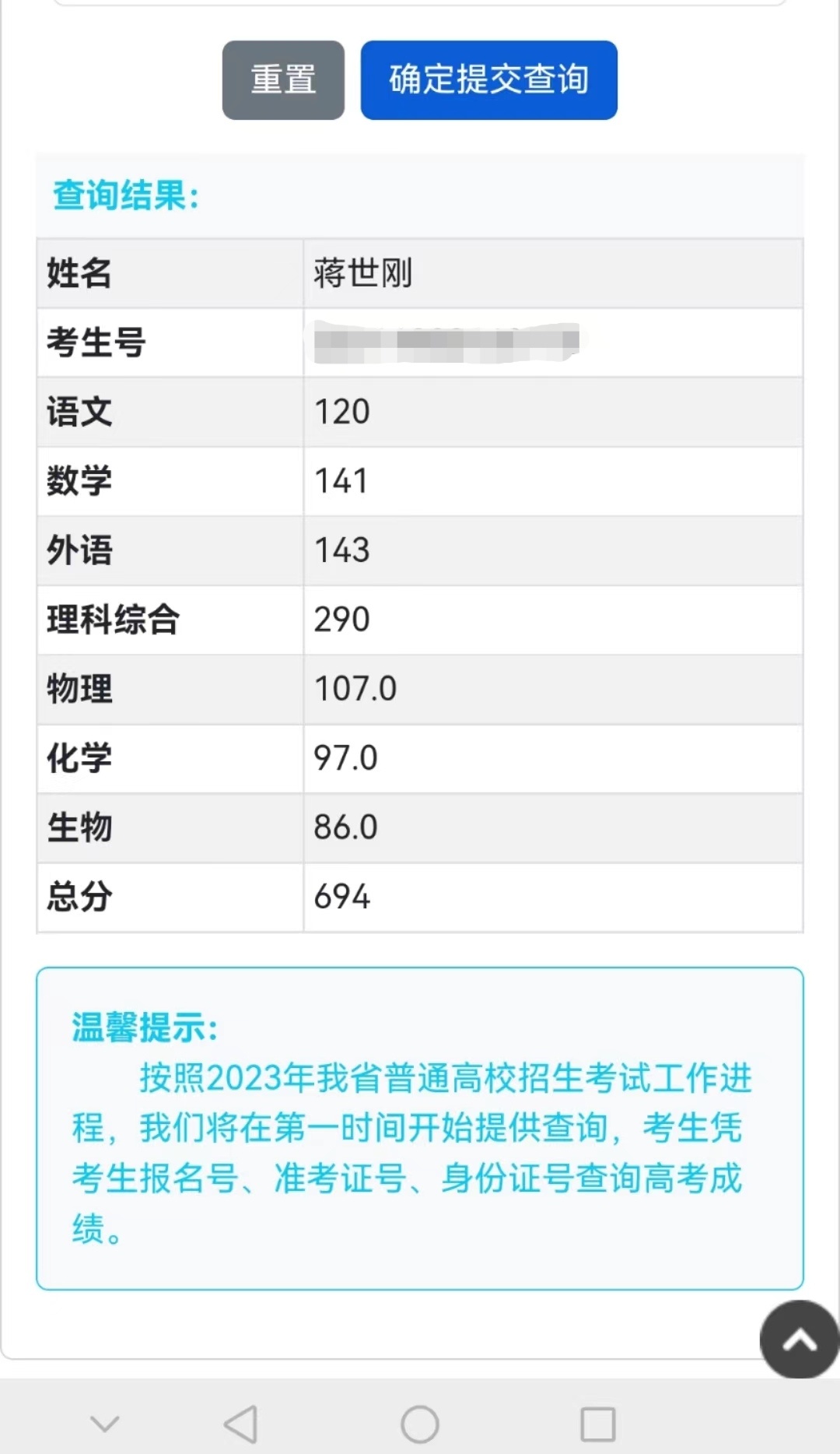 6月23日晚上,高考放榜。四川省安岳中学高三14班学生蒋世刚查询到高考成绩:694分。分别为语文120分、数学141分、英语143分、理科综合290分。