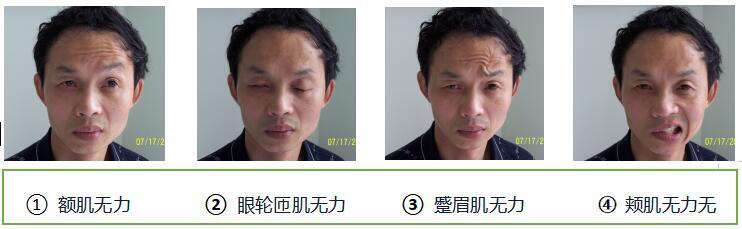 (1)发病急,典型表现:①患侧上视额纹、鼻唇沟变浅或消失;②患侧眼裂增宽,闭眼不全;③患侧皱眉不能;④露齿口角向健侧歪斜/嘴角下垂,简单来说就是眼歪、脸歪、嘴歪。