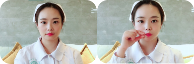 方法:鼓腮漏气时,用手上下捏住患侧口轮匝肌进行鼓腮训练。