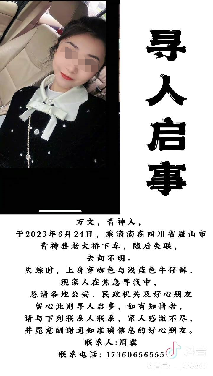 6月25日,四川青神的一则寻人信息引发关注。信息显示,青神女子万文在2023年6月24日乘坐网约车,在青神县老大桥下车,随后失联,去向不明。