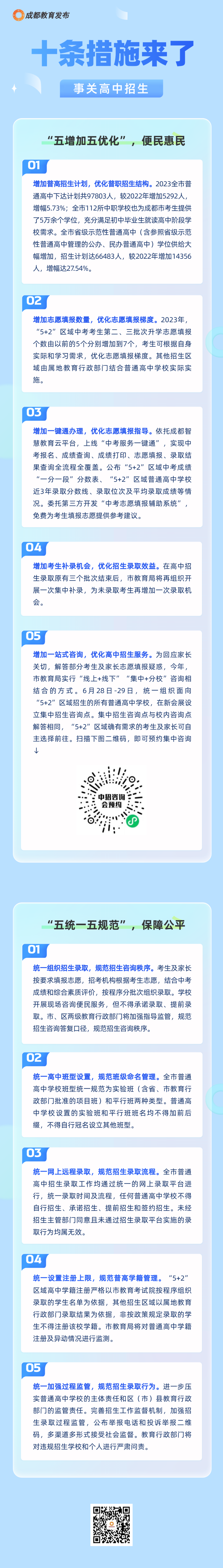 会上,成都市教育局印发了《关于进一步优化和规范普通高中招生录取工作的十条措施》。小编为您梳理了“五增加五优化、五统一五规范”,请您仔细阅读、了解。