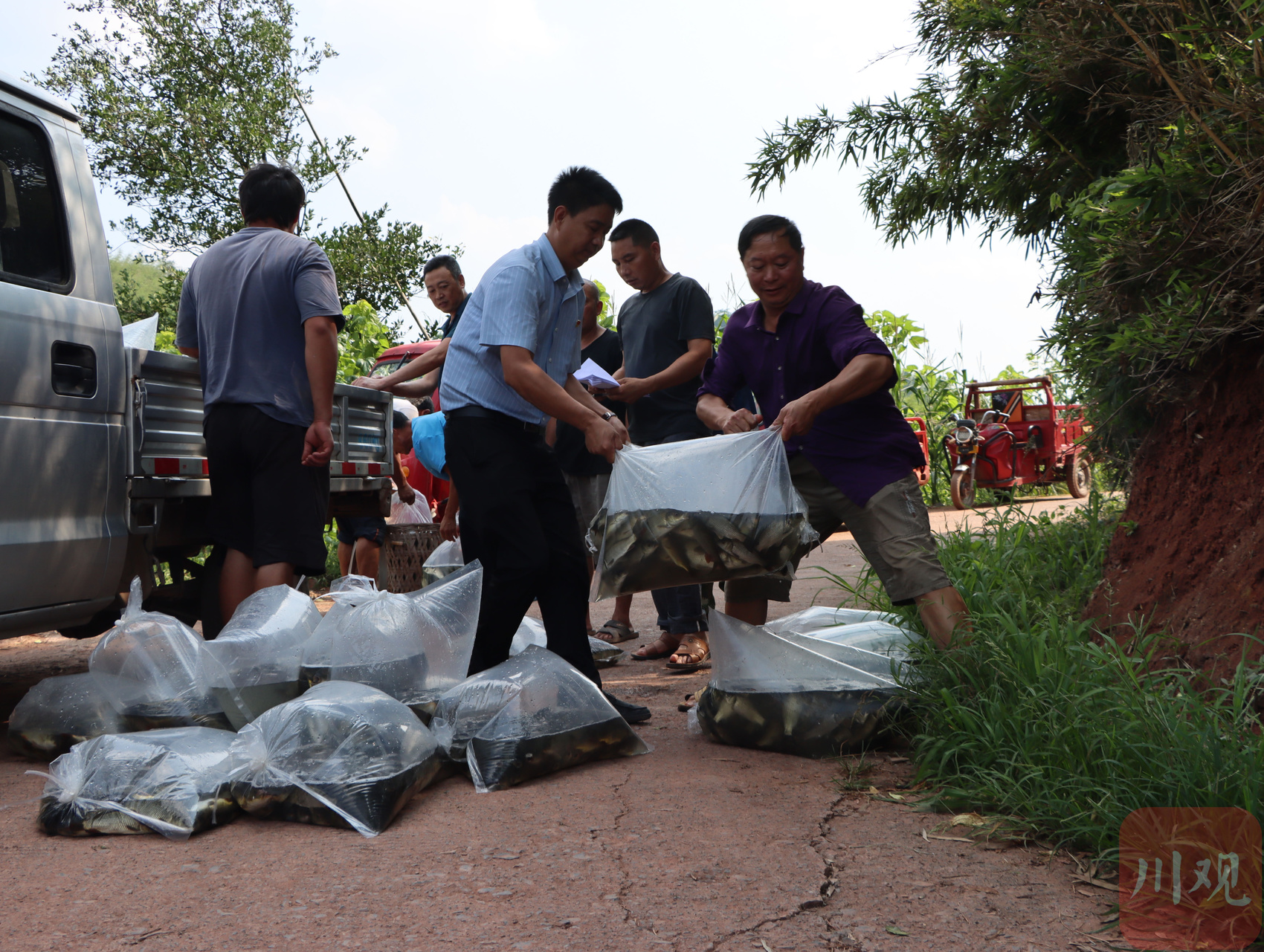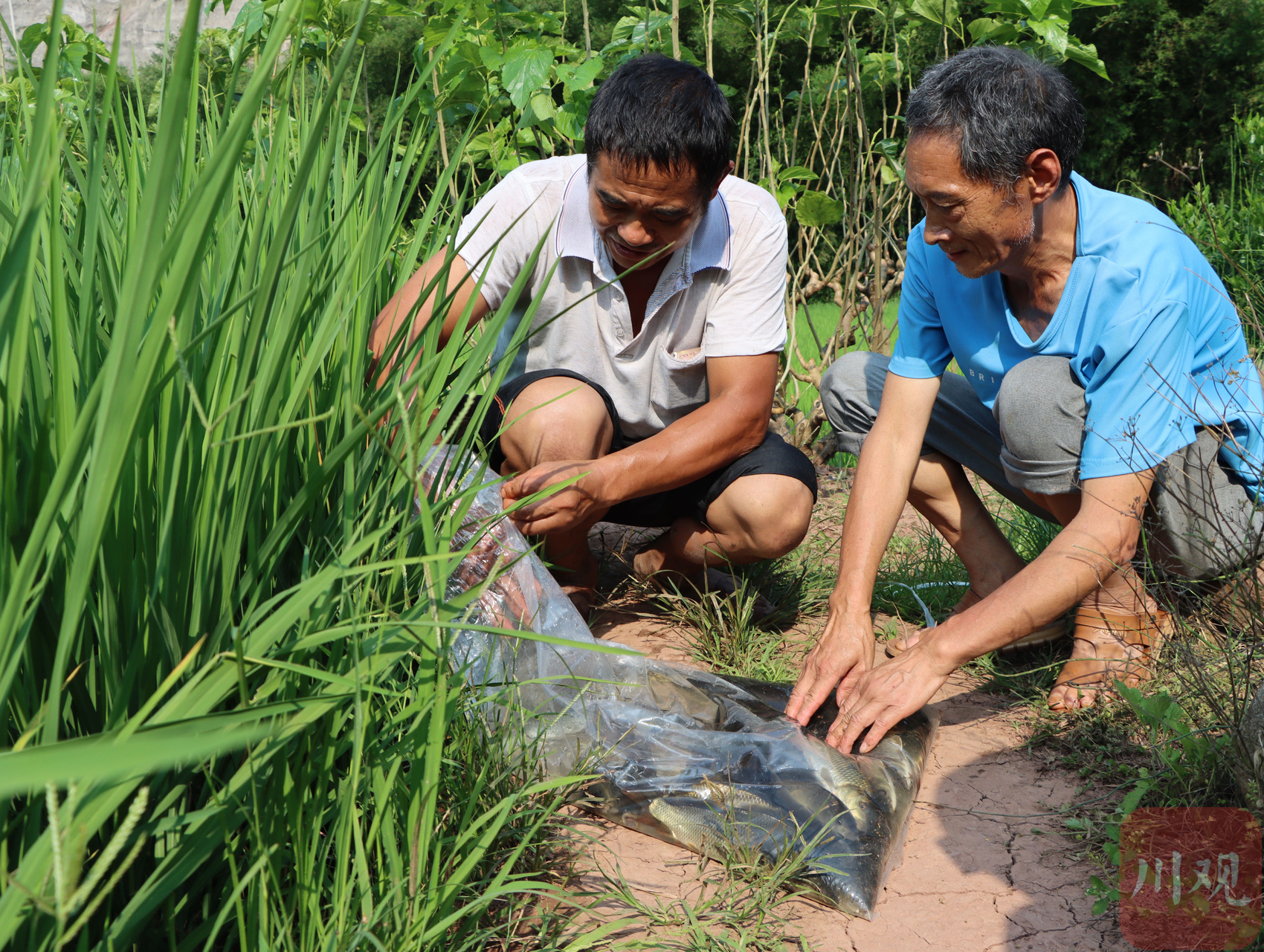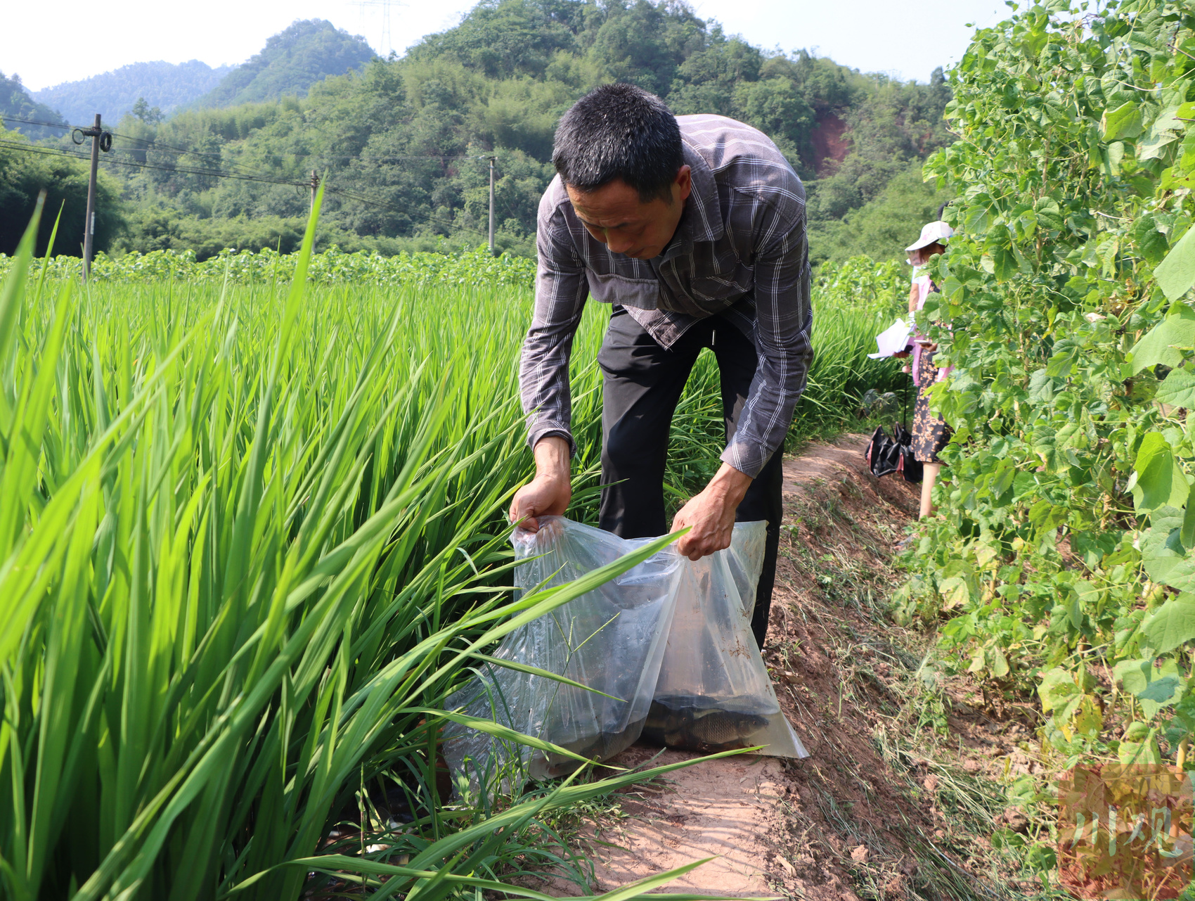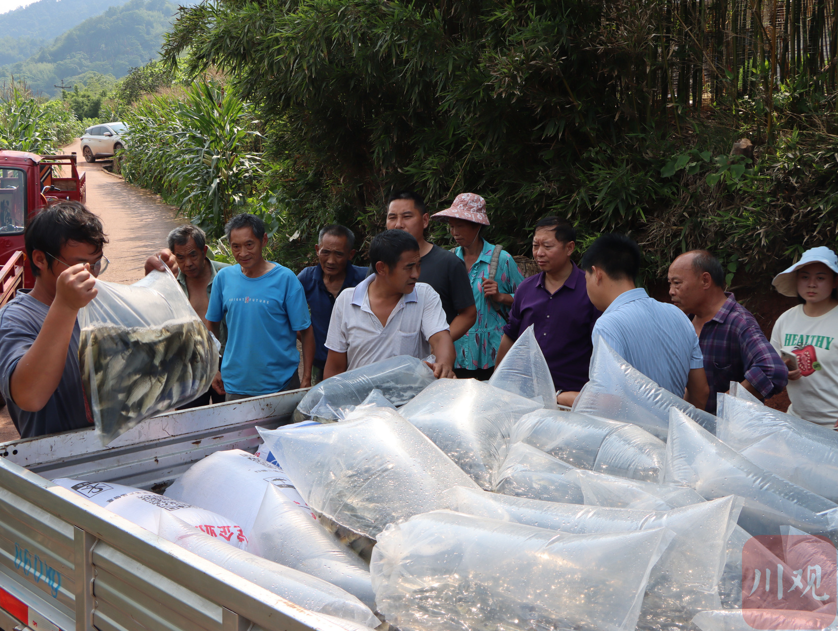 6月25日,在宜宾高县可久镇永安村“稻田养鱼”项目鱼苗集中发放点,村民有序领取鱼苗投放到绿油油的稻田。
