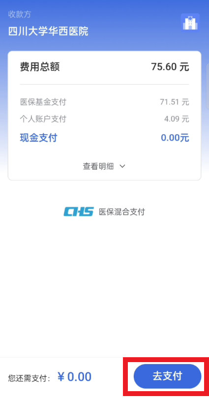 如果是通过“华医通”APP缴费,将自动跳转到“支付宝”APP中的“四川大学华西医院小程序”,点击“去支付”就可以了