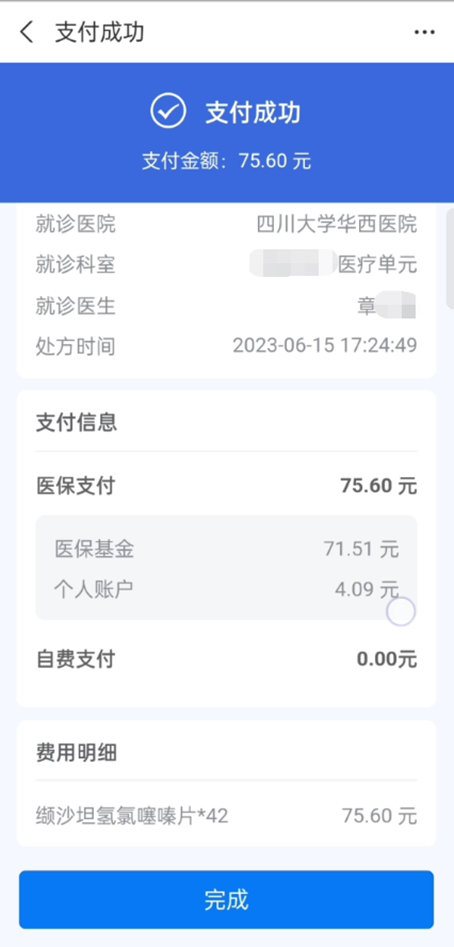 (1)四川大学华西医院微信公众号,在缴费时选择医保支付,需人工手动再打开“支付宝”APP中的“四川大学华西医院小程序”进行支付。