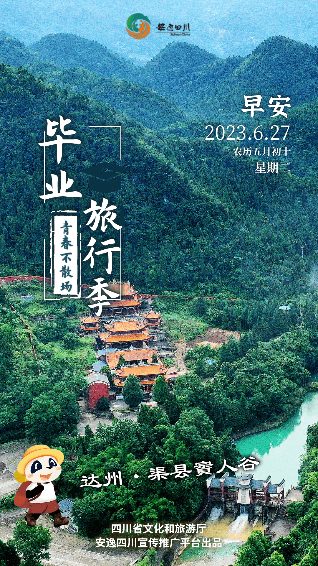 6月27日,星期二。今日安逸四川日历海报毕业季之旅走进达州渠县賨人谷,在秀美自然风光中感受独特古賨文化。