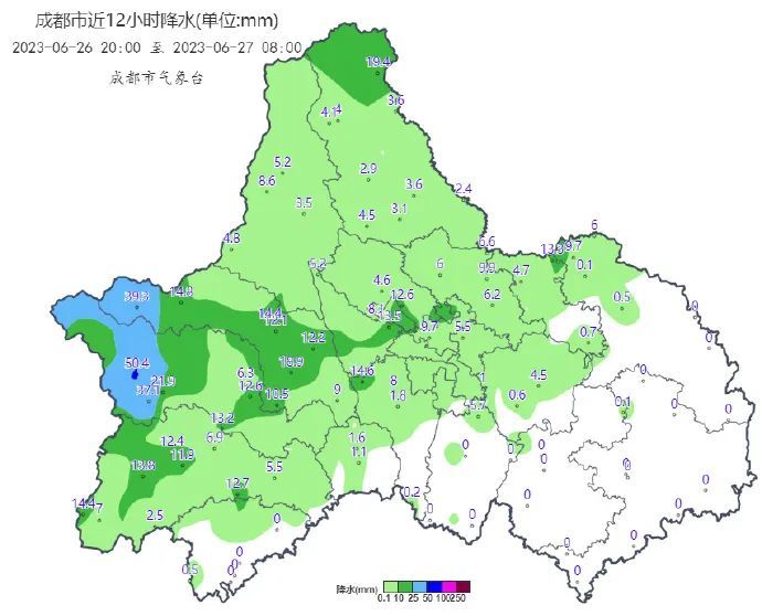全市共计出现小雨255站,中雨49站,大雨6站,暴雨1站。最大降水量出现在大邑西岭花石50.4毫米。各区(市)县最大降雨量:崇州文井江万担坪39.3毫米、彭州龙门山银厂沟19.4毫米、双流彭镇鲢鱼14.6毫米、邛崃天台山靖口14.4毫米、温江永宁13.5毫米、青白江城厢十八湾13.3毫米、郫都红光12.6毫米、新都大丰11.7毫米、高新区科大清水河11.4毫米、都江堰青城山成青10.5毫米、金牛区茶店子客运站9.7毫米、金堂官仓天海9.7毫米、蒲江西来9.7毫米、青羊区人民公园8.4毫米、成华区青龙5.5毫米、武侯区浆洗街武侯祠5.3毫米、新津宝墩李柏5.2毫米,其余区(市)县在5毫米以下。一小时最强降水出现在大邑花水湾28毫米。我市大邑、都江堰和彭州等地出现瞬间最大风速大于10m/s的大风天气,最大风速在都江堰龙池紫坪11.5m/s(6级)。