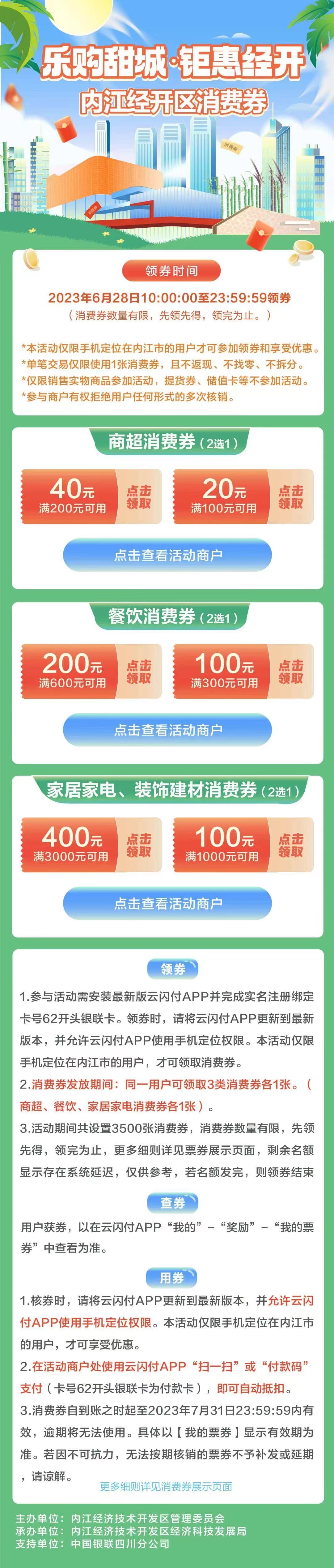据了解,本次活动将于6月28日上午10点正式启动,届时手机定位在内江市的用户均可领取,同一用户最多可领取3类消费券各1张(商超消费券、餐饮消费券、家居家电消费券各1张)。活动期间总共设置消费券3500张,领完为止。