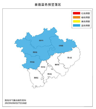 6月27日16时,南充市气象台发布暴雨蓝色预警:受高空低槽和偏南暖湿气流共同影响,预计27日夜间至28日夜间全市将有一次强降雨天气过程。其中阆中、南部、仪陇和西充有大雨到暴雨(30—70mm),个别乡镇可达100mm以上,市辖三区、营山和蓬安有中雨到大雨(20—40mm),个别乡镇可达50mm以上。过程中伴有短时强降水、雷电和局地阵性大风等强对流天气,最大小时降雨量可达30—40mm。