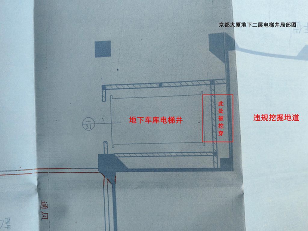 物业向记者提供了一张京都大厦地下二层的建筑平面图。图上显示,电梯井周围有两层墙体。物业方面介绍,内侧“虚线”的一层为红砖墙,外侧“黑线”墙体是具有承重功能的剪力墙。两层墙体都已被挖穿。