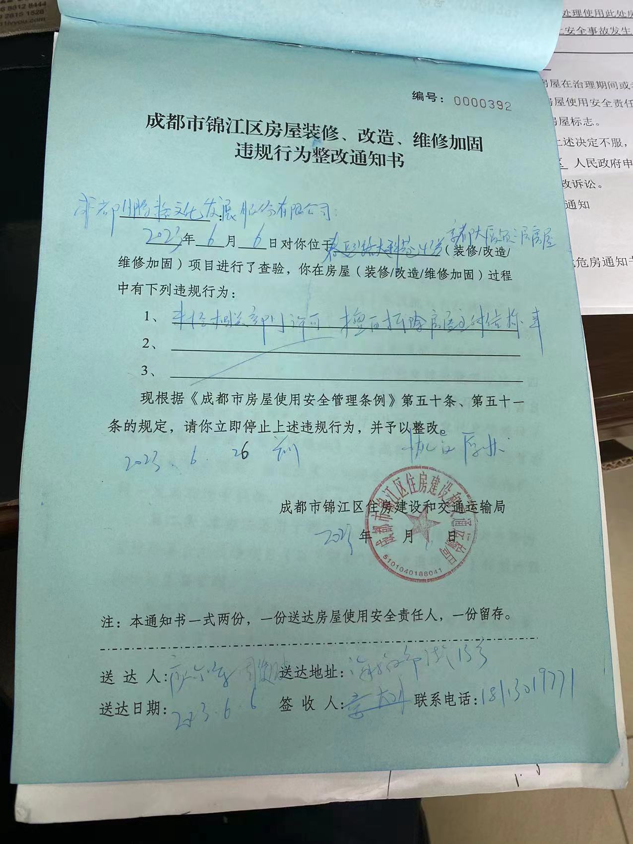 成都市锦江区住房建设和交通运输局开具的整改通知书