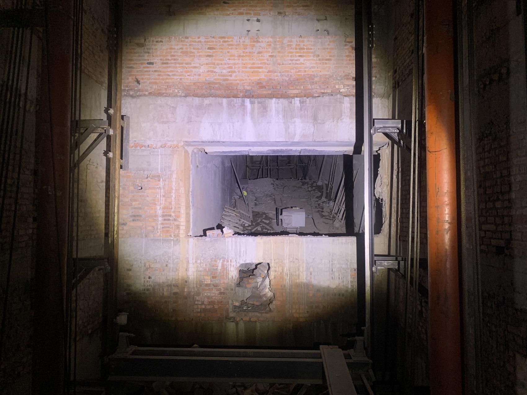几位业主和京都大厦物业人员带着记者多次前往事发现场查看。7月,记者第一次采访时看到,电梯井地下二层一侧的外墙被掏出了一个方形的大洞,目测洞的面积约10平方米。洞外连接着一段坡道,坡道上放着一些施工设备,大厦地下二、三层的新业主曾在这里组织施工。