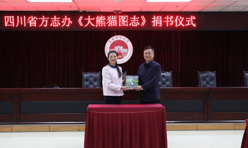 10月28日,四川省地方志办机关党委书记邓瑜向西华师范大学校长王元君赠送《大熊猫图志》。