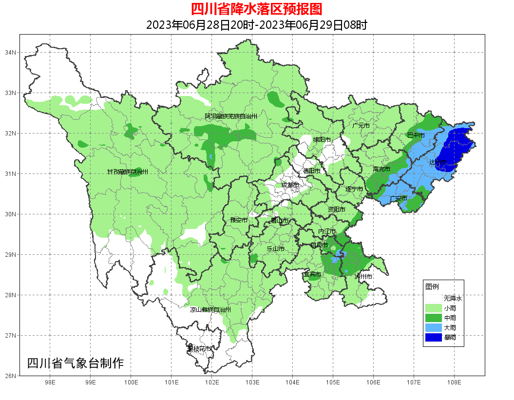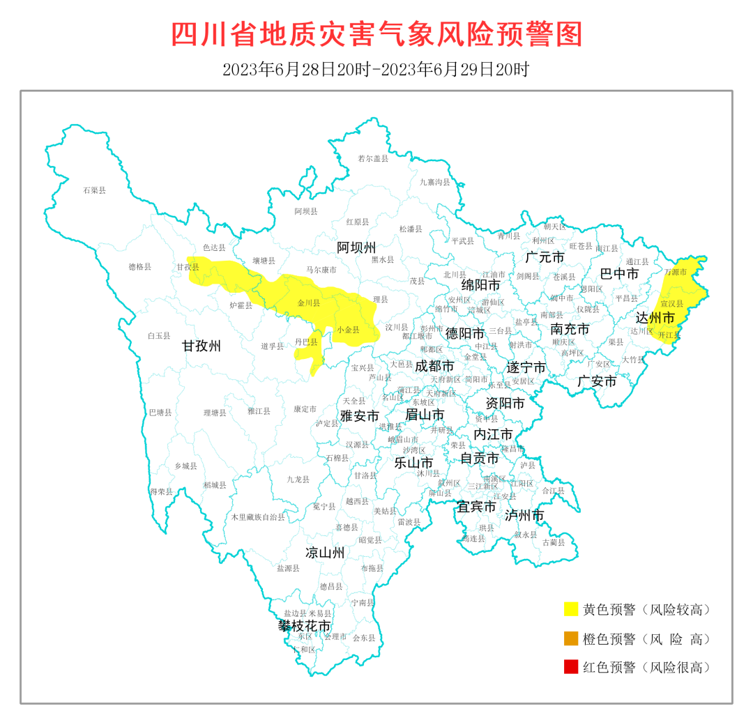 结合天气预报情况,6月28日20时-6月29日20时,达州东北部、阿坝州西南部、甘孜州东北部局地发生地质灾害的风险较高。请上述地区加强地质灾害防范工作。