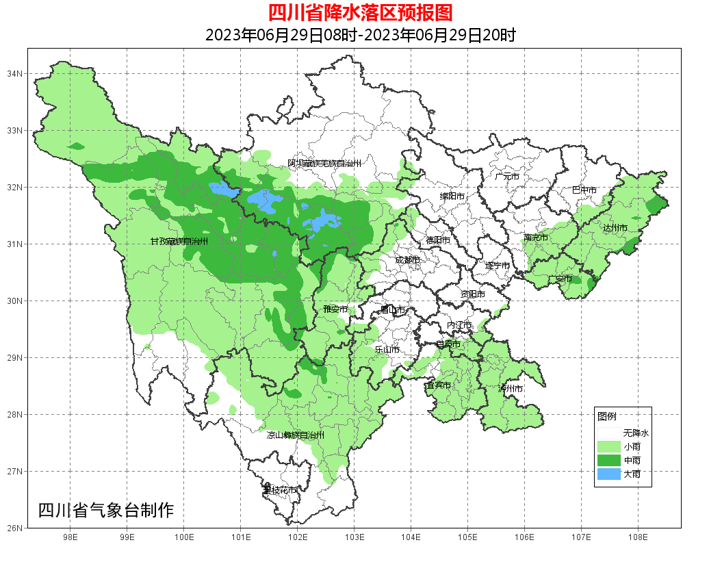 29-30日盆地大部以多云天气为主,7月1日多云转阴天有阵雨或雷雨,其中东北部有中到大雨;未来三天,川西高原和攀西地区阴天间多云多雷阵雨,局地有中到大雨,需防范局地强降水带来的滑坡、泥石流、山洪等气象次生灾害。
