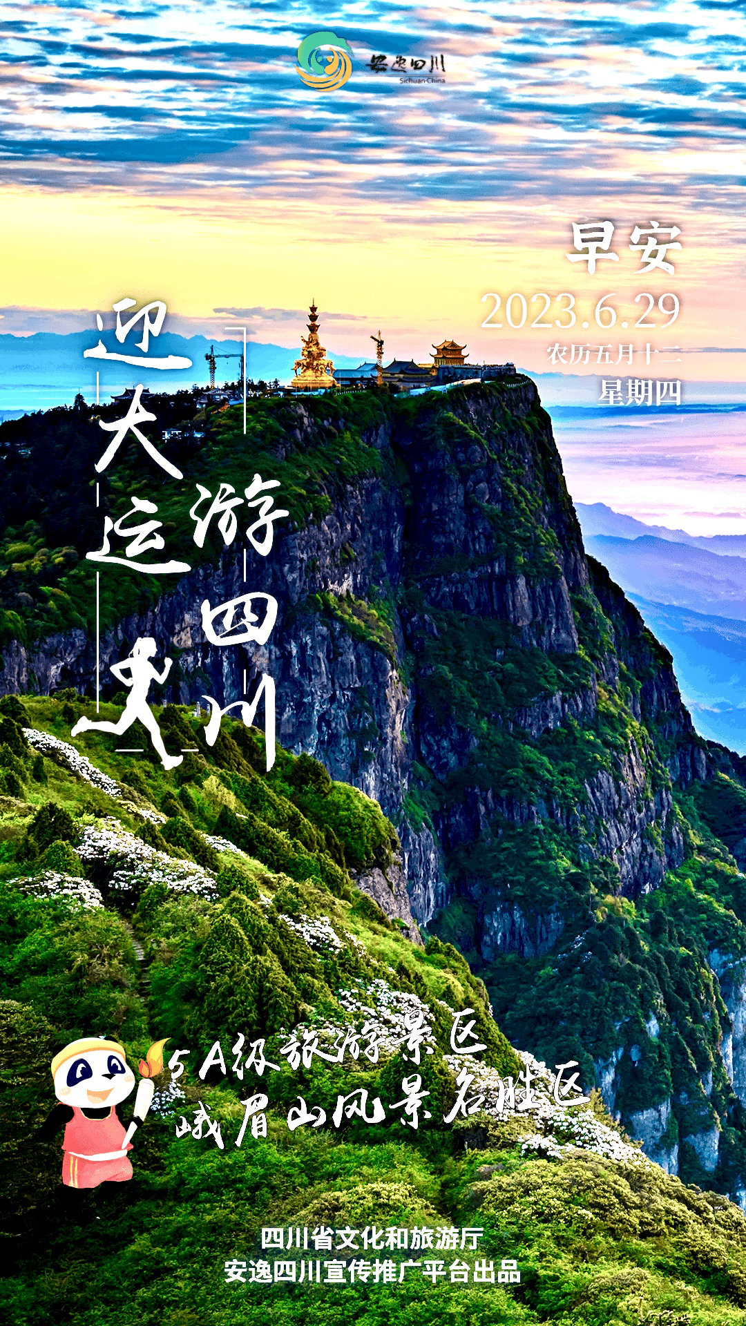 6月29日,星期四。今日安逸四川日历海报“迎大运、游四川”之旅来到峨眉山风景名胜区,看云海翻涌的诗意风景。