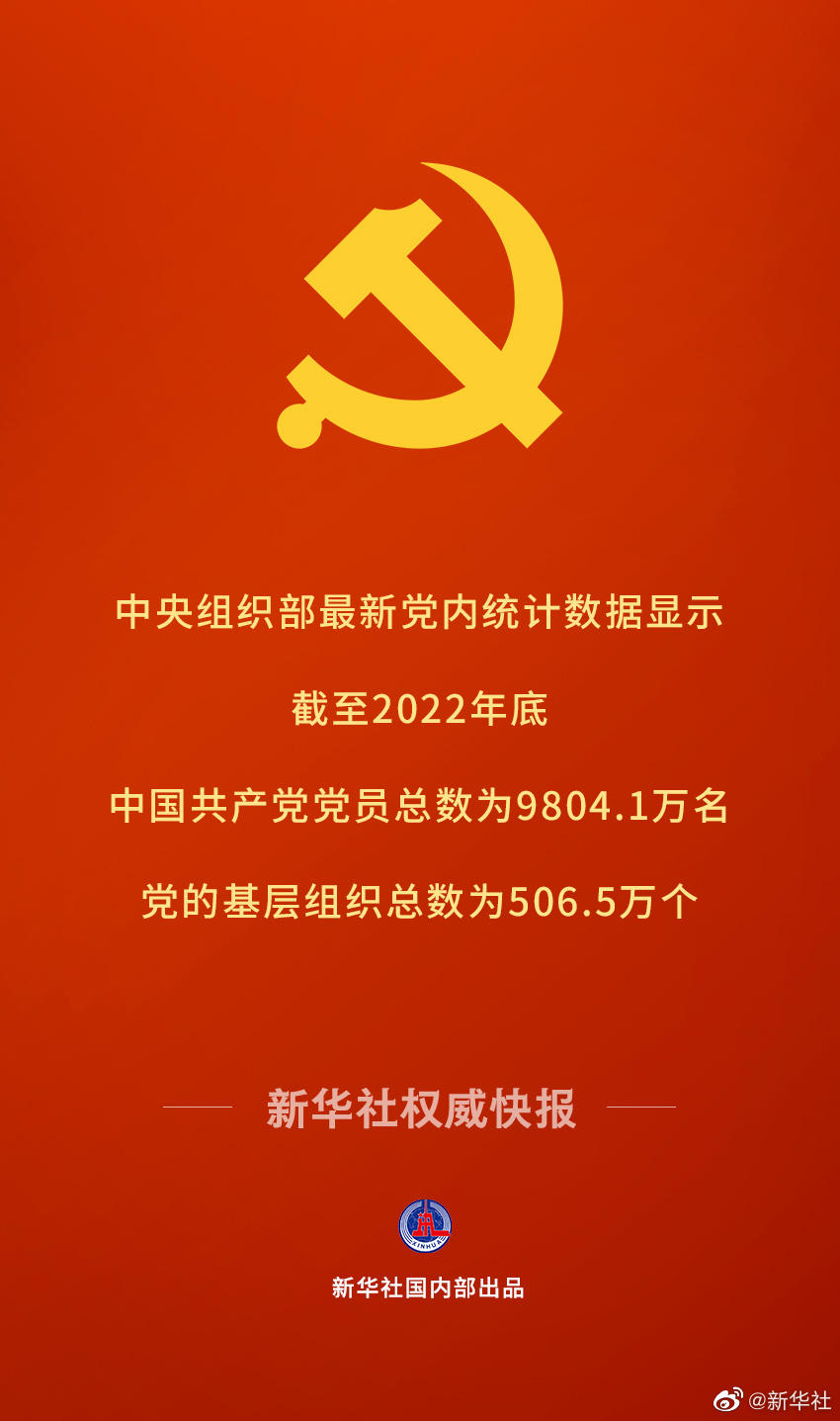 中央组织部最新党内统计数据显示,截至2022年底,中国共产党党员总数为9804.1万名,比上年净增132.9万名,党的基层组织506.5万个,比上年净增12.9万个。