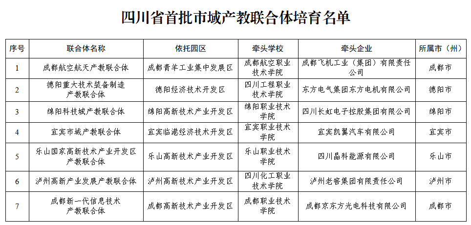 6月30日,四川省首批7个市域产教联合体培育名单正式出炉。根据四川省教育厅、四川省经济和信息化厅、四川省财政厅、四川省人力资源和社会保障厅有关要求,按照公平、公正、客观、择优的原则,经市(州)组织申报、专家评审、四部门会商审定,确定了“成都航空航天产教联合体”等四川省首批7个市域产教联合体培育名单。具体如下表: