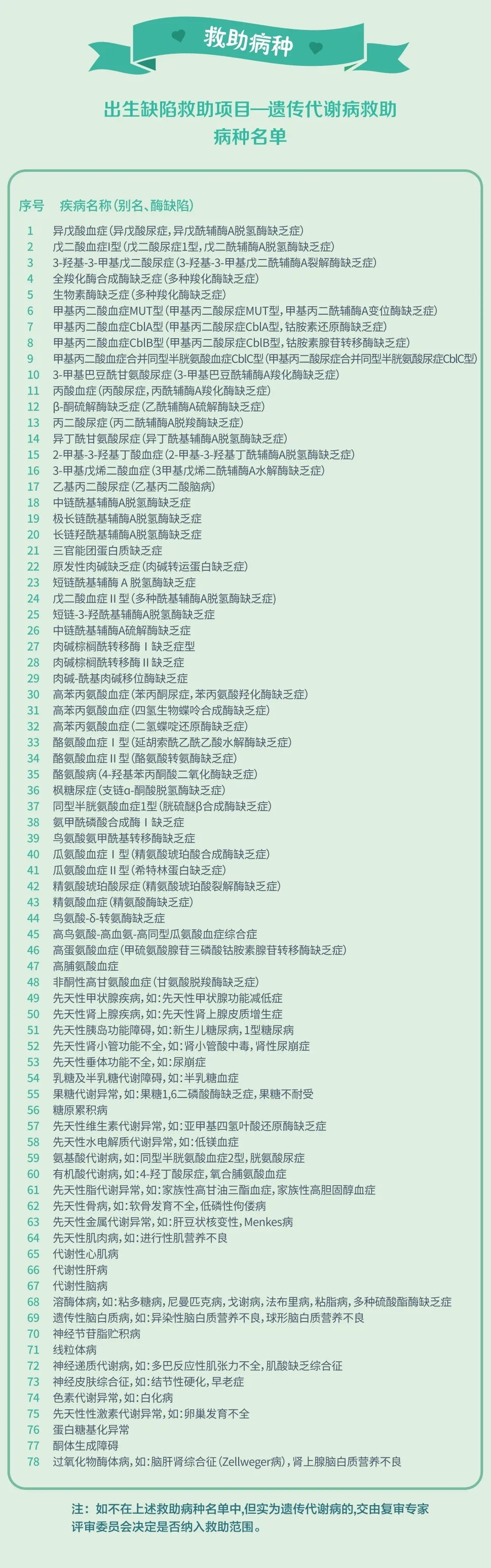 答:1.遗传代谢病救助项目救助病种包含78种遗传代谢性疾病,如病种不在救助名单内,但实为遗传代谢病的,交由复审专家评审委员会决定是否纳入救助范围: