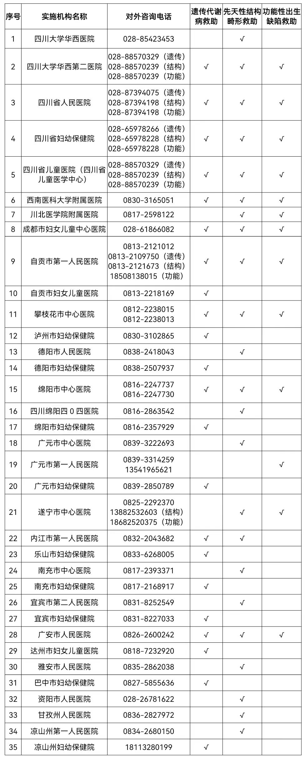 记者日前从四川省卫生健康委员会获悉,目前全省共有遗传代谢病救助项目实施机构22家,先天性结构畸形救助项目实施机构23家,功能性出生缺陷救助项目实施机构13家。