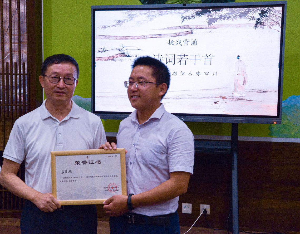 “花径不曾缘客扫,蓬门今始为君开”“锦城丝管日纷纷,半入江风半入云”,孟基殿在不到一小时的时间里,不疾不徐地背诵出28位唐、宋、明诗人的写四川的诗词作品65题83首,赢得现场观众和杜甫草堂博物馆工作人员阵阵掌声。随后,刘洪将挑战成功荣誉证书赠予孟先生,并现场为其办理终身免费入馆手续。