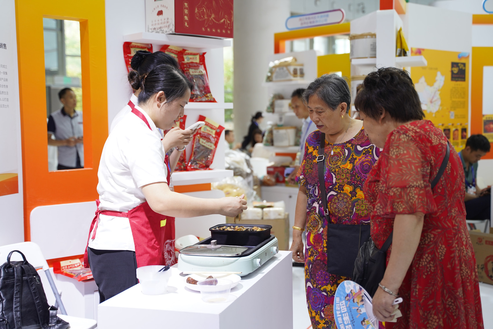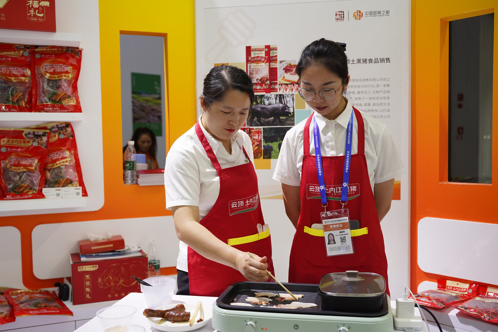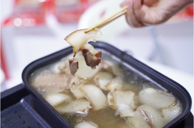 当天上午,内江综合展示馆各类产品琳琅满目,30家代表企业带着200多个品种的产品在“甜味+”板块进行展出,成为场馆内的“人气展区”。其中,四川恒通带来的内江黑猪肉香肠、腊味小食等美食免费品鉴区吸引了不少关注,给参展人员留下深刻的印象。