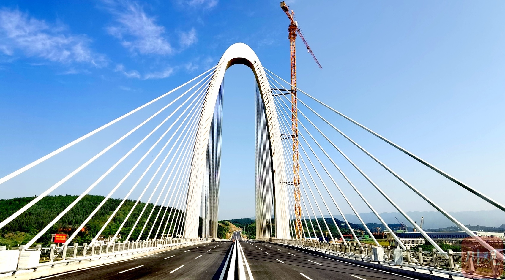 大桥主塔高130米,斜拉索23对,主桥为独塔双索面斜拉桥,整体为白色拱形设计。为了应对高主塔施工过程中带来的高风险,施工方先后申请了包括“一种拱式托架装置”“用于增大斜拉桥悬臂施工稳定性的抗风装置”“一种高空横向混凝土构建施工用复合式托架系统”在内的3项实用新型专利,有效解决了高空和塔冠施工过程中面临的安全、稳定、抗风等问题。
