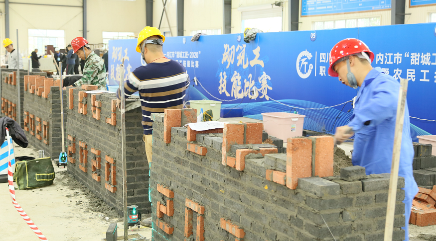 10月28日,四川技能大赛—内江市“甜城工匠·2020”职业技能大赛暨农民工技能比赛砌筑项目在内江职业技术学院举行,记者在现场看到参赛选手们正在和水泥、吊垂线、给砖湿水……虽然是比赛,但大家都忙得不亦乐乎。
