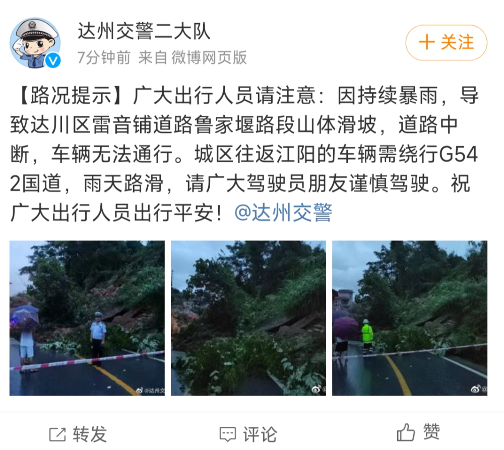 今日(7月2日)上午,达州市交警支队二大队发布路况信息,因持续暴雨,导致达川区雷音铺道路鲁家堰路段山体滑坡,道路中断,车辆无法通行。达州交警提示,城区往返江阳的车辆需绕行G542国道,雨天路滑,请广大驾驶员朋友谨慎驾驶。