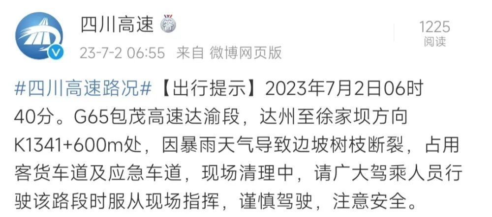 记者还了解到,四川高速发布路况信息,2023年7月2日06时40分,G65包茂高速达渝段,达州至徐家坝方向K1341+600m处,因暴雨天气导致边坡树枝断裂,占用客货车道及应急车道,现场清理中,请广大驾乘人员行驶该路段时服从现场指挥,谨慎驾驶,注意安全。