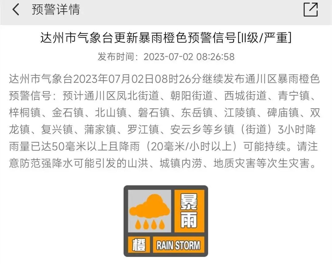 2023年7月2日8时26分,达州市气象台继续发布通川区暴雨橙色预警信号:预计通川区凤北街道、朝阳街道、西城街道、青宁镇、梓桐镇、金石镇、北山镇、磐石镇、东岳镇、江陵镇、碑庙镇、双龙镇、复兴镇、蒲家镇、罗江镇、安云乡等乡镇(街道)3小时降雨量已达50毫米以上且降雨(20毫米/小时以上)可能持续。请注意防范强降水可能引发的山洪、城镇内涝、地质灾害等次生灾害。人员避免外出,不要在高楼、大树等危险区域下方躲雨或停留。