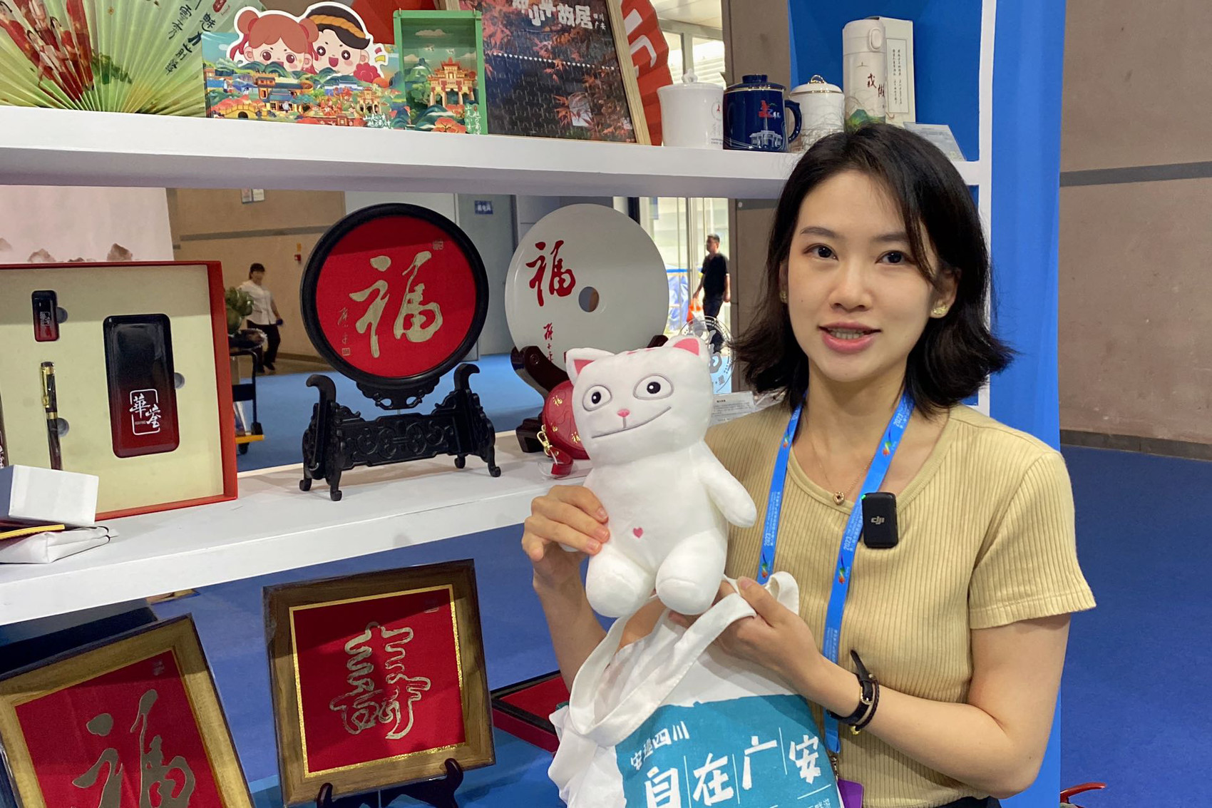 今年广安还带来了最新推出的文旅产品。“广安文旅吉祥物是黑猫和白猫,在去年站立姿势的公仔基础上,我们今年新推出了坐立姿势的黑猫白猫,造型更加生动可爱。除此之外,还推出了‘安逸四川 自在广安’新款环保袋,上面有小平故里、华蓥山、嘉陵江等广安特色元素。”广安市文广旅局现场负责人介绍,而此次新推出的文旅产品也成为今年西旅会最受欢迎的展品。