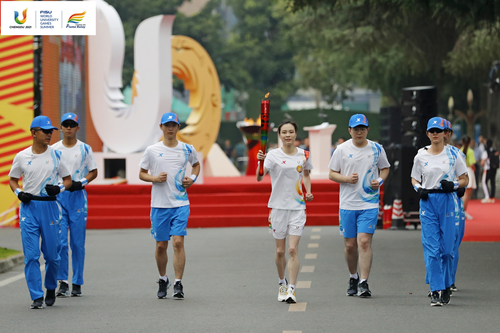 在成都大运会火炬传递主题曲《我们都是追梦人》的旋律中,火炬传递成都站(四川大学)第1棒火炬手、跳水奥运冠军吴敏霞高擎火炬,开始了“蓉火”在成都的传递。