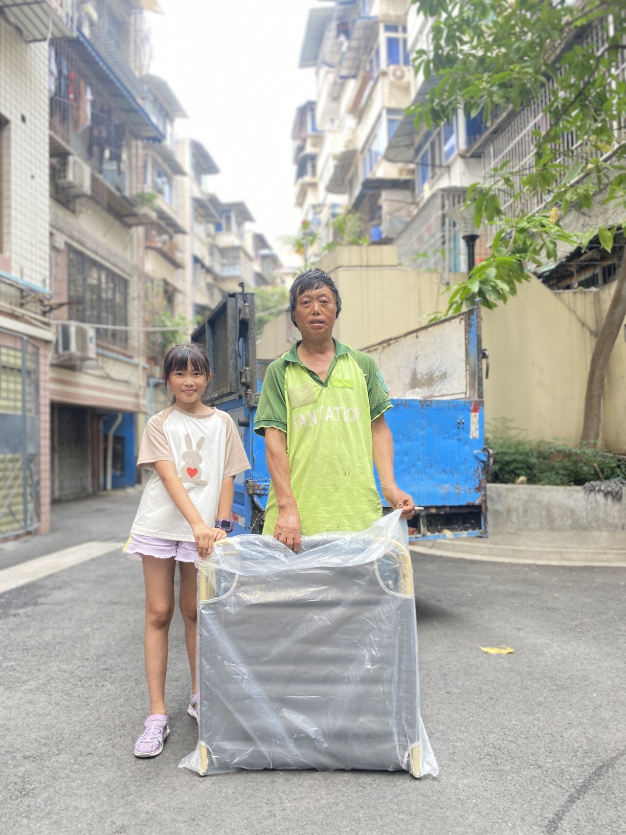 7月1日,琬扬和父亲一起领了爱心床后决定:去望平街找环卫工人!这条网红街人多垃圾可能更多,环卫工人一定很辛苦。一名女环卫工想到了姚荣富,给了父女俩一个手机号:“他年纪大,比我们更需要。”