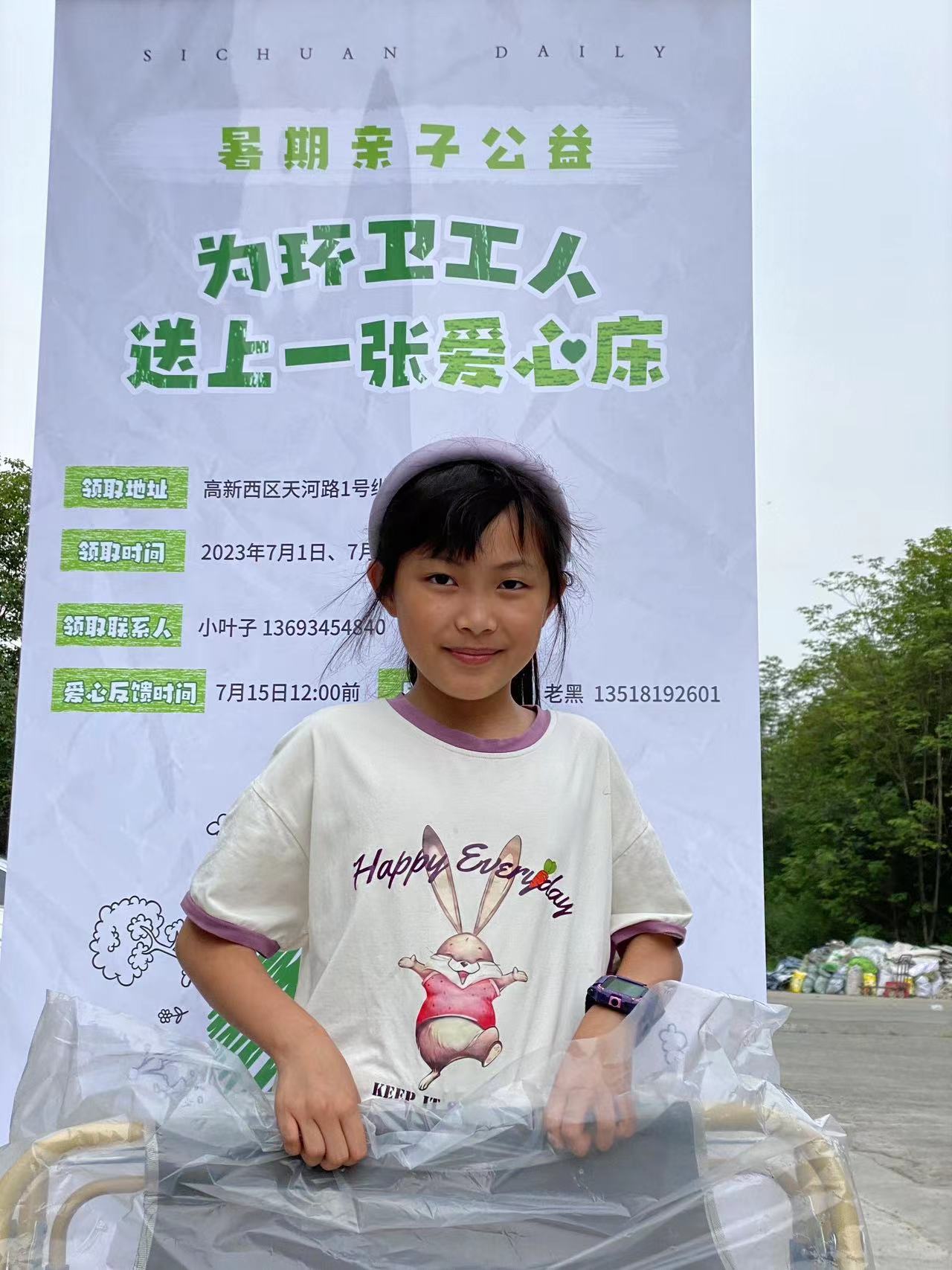 谭祯羽:我们去仓库领取了爱心床后,就开始寻找辛苦的环卫工人。功夫不负有心人,不一会儿,我们就找到一位顶着烈日,辛勤工作的环卫阿姨。我给阿姨说了我们的活动,爸爸妈妈拿出了准备送给她的爱心床。阿姨又惊讶又开心,反复问我们,说:“要给钱吗?”我认真地给阿姨说:“这个是爱心公益活动,不要钱,阿姨你辛苦了!”环卫阿姨这才收下了床,她十分开心。我觉得这个活动非常有意义,我帮助了他人,我也很开心。