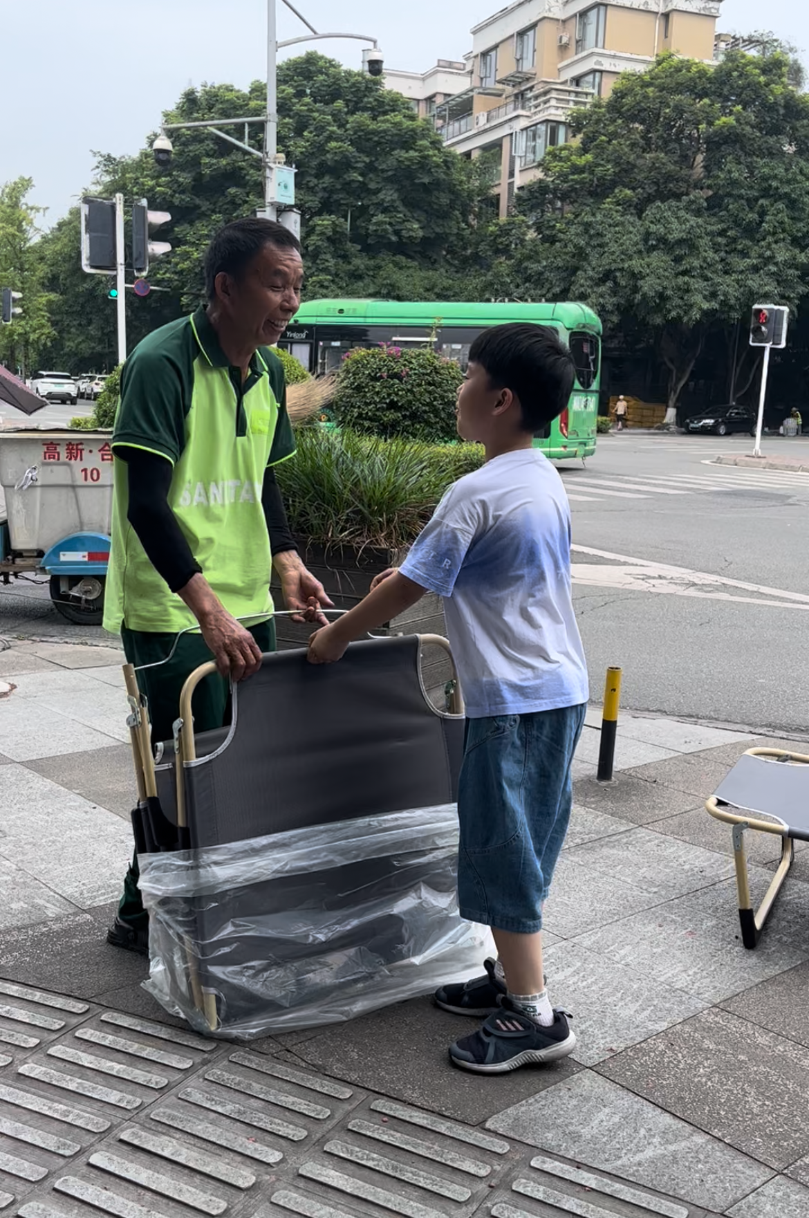父子俩马上赶回家取了床,再回到现场,环卫阿姨正收拾一袋大垃圾。父子俩快步向前,帮她把垃圾拖上小车,再把爱心折叠床送到她手里。环卫阿姨笑得合不拢嘴,连声道谢,小橙曦回谢道:“阿姨,不谢,我们要谢的是你们!是你们让我们拥有着干净的城市。”