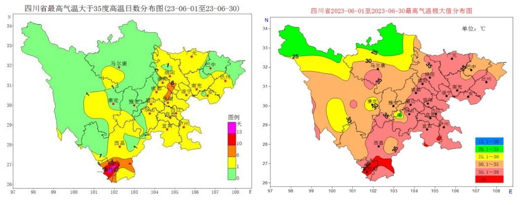 2023年6月四川省高温日数(左)和日最高气温(右)分布图