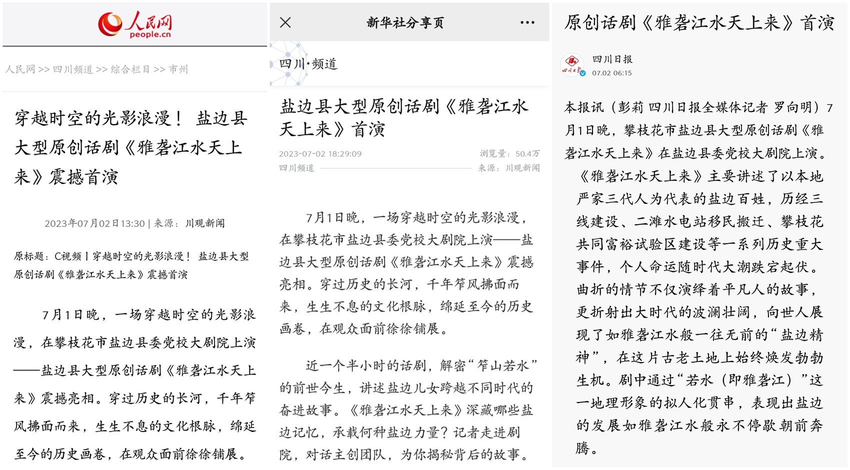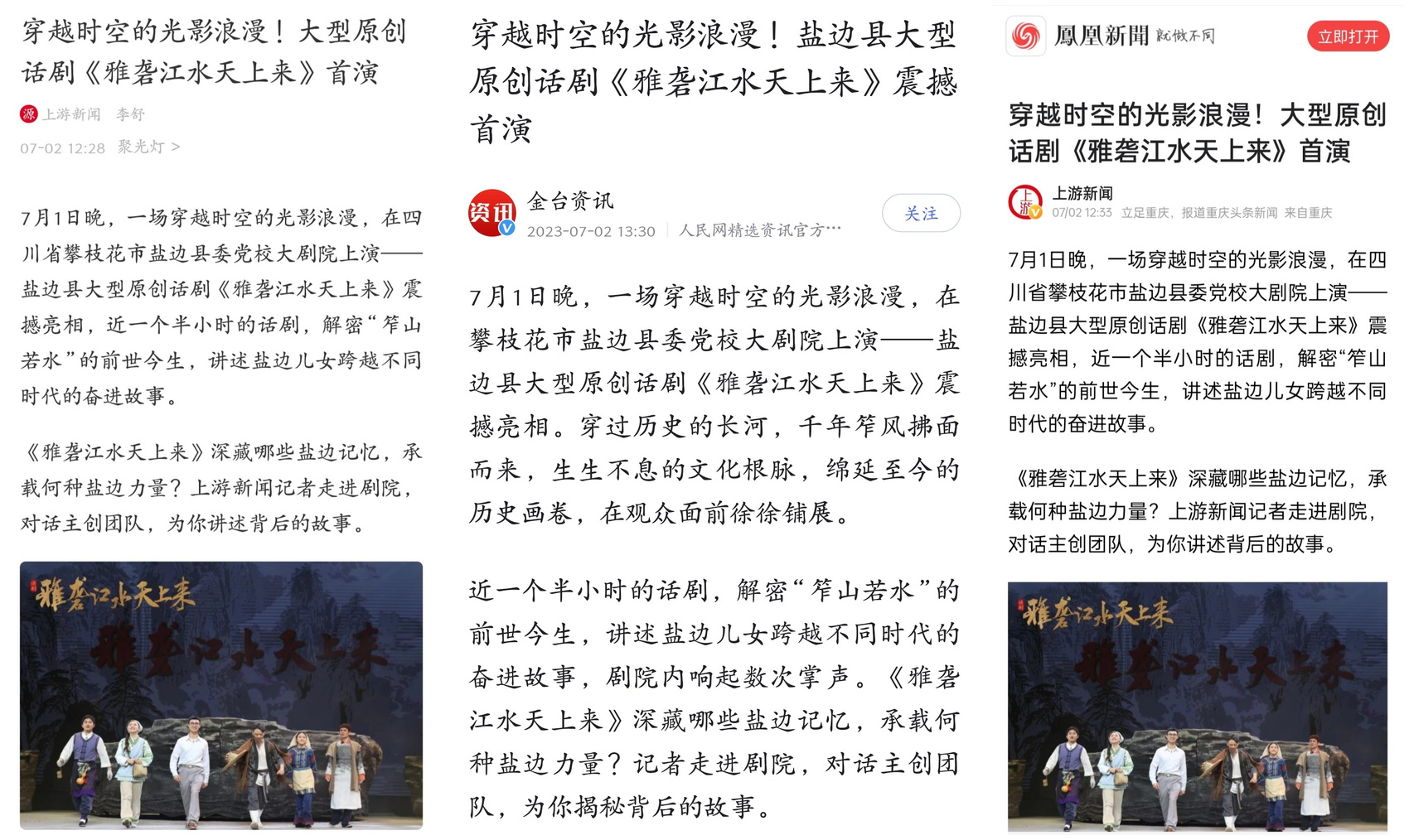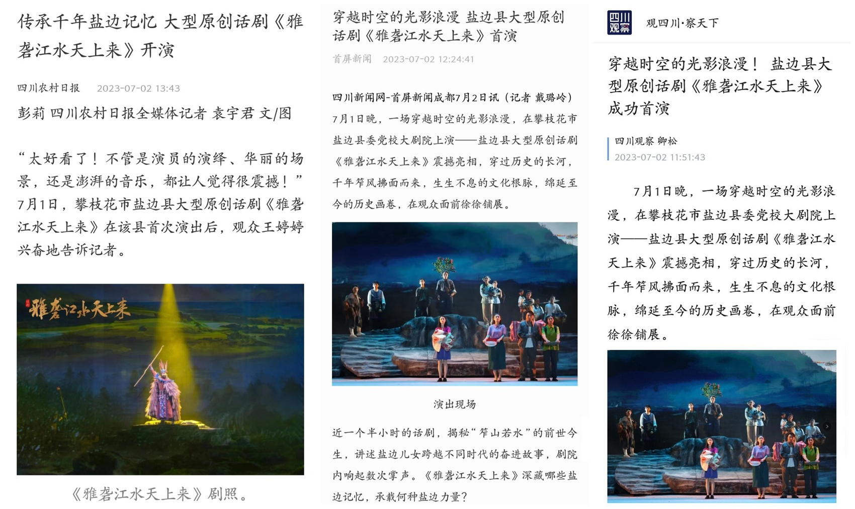 发布媒体包括人民网、新华社、四川日报、川观新闻、四川观察、重庆日报、封面新闻、四川在线、四川农村日报、四川法治报、四川新闻网、红星新闻、四川经济日报等央媒及省级主流媒体,向全国千万网友展示和推介盐边文化传承,进一步营造氛围扩大影响力。其中,首演第二天,四川日报要闻版就对盐边这一原创话剧进行重点报道,24小时内,新华社客户端关于《雅砻江水天上来》的首演报道浏览量超50万。