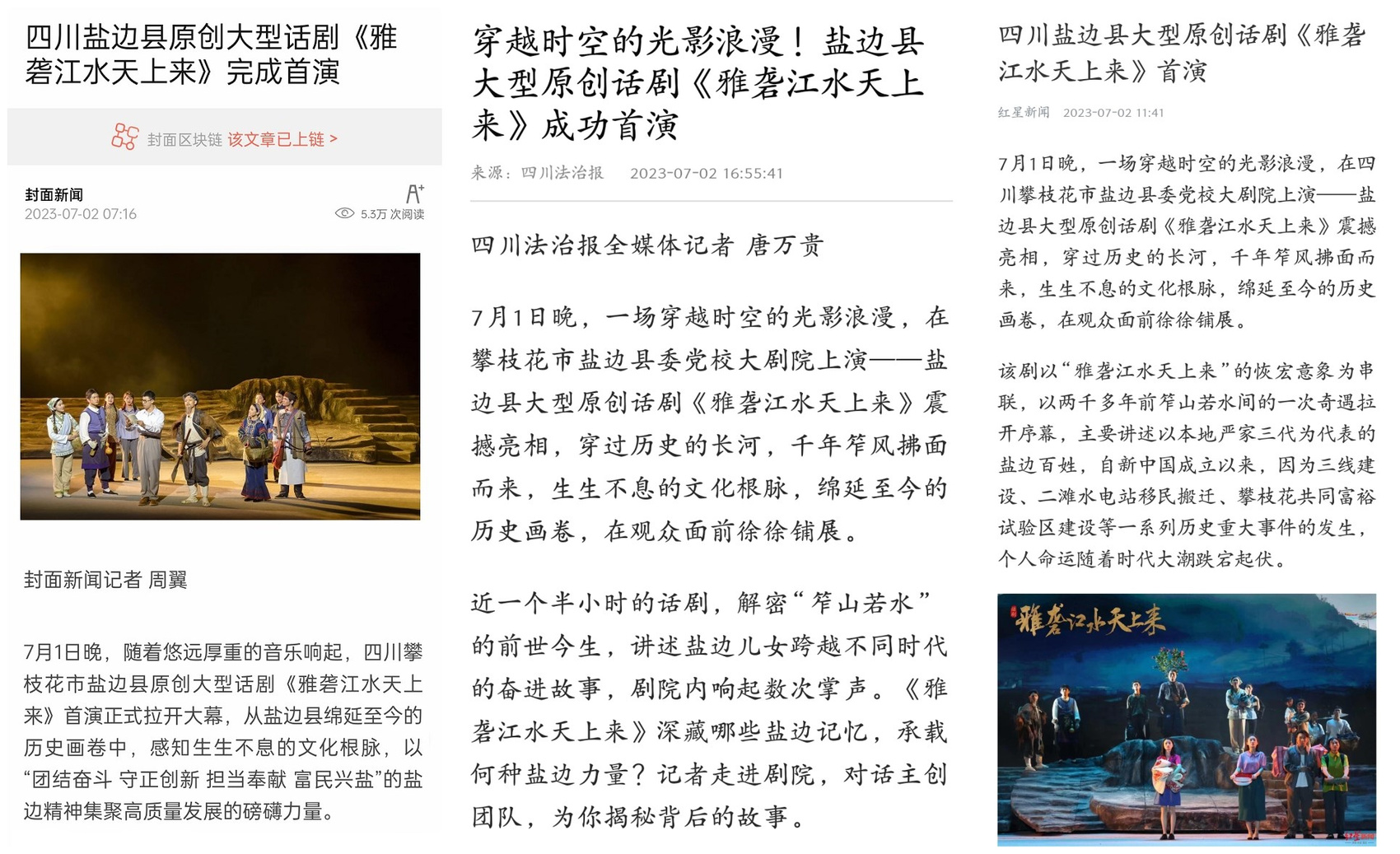 如火七月,比气温更火爆的,是来自攀枝花市盐边县的一部大型原创话剧——《雅砻江水天上来》,这场倍受关注的“光影盛宴”,于“七一”演出“首战告捷”,迅速引爆全网,引起国内主流媒体强势关注。