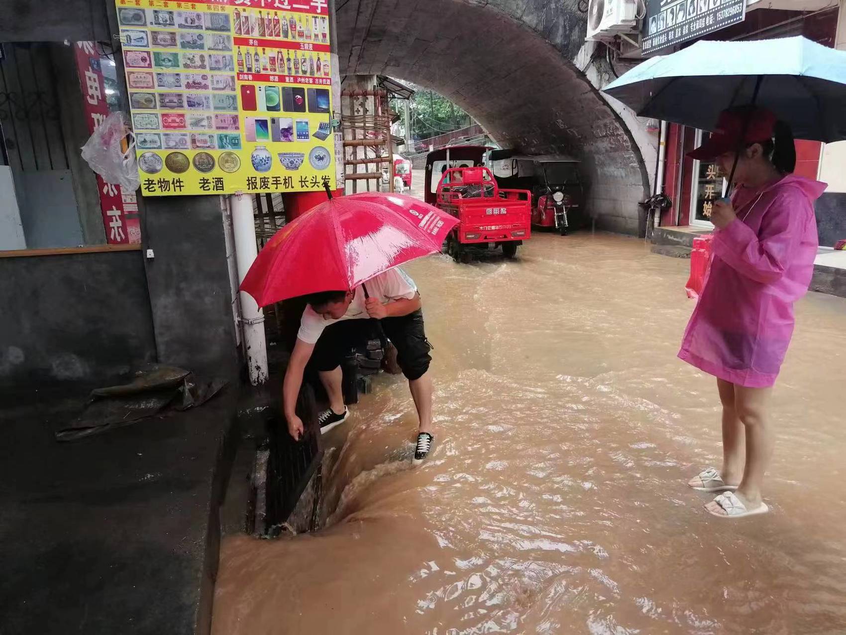 图为旺苍县木门镇组织党员干部整治街道因强降雨堵水街道。