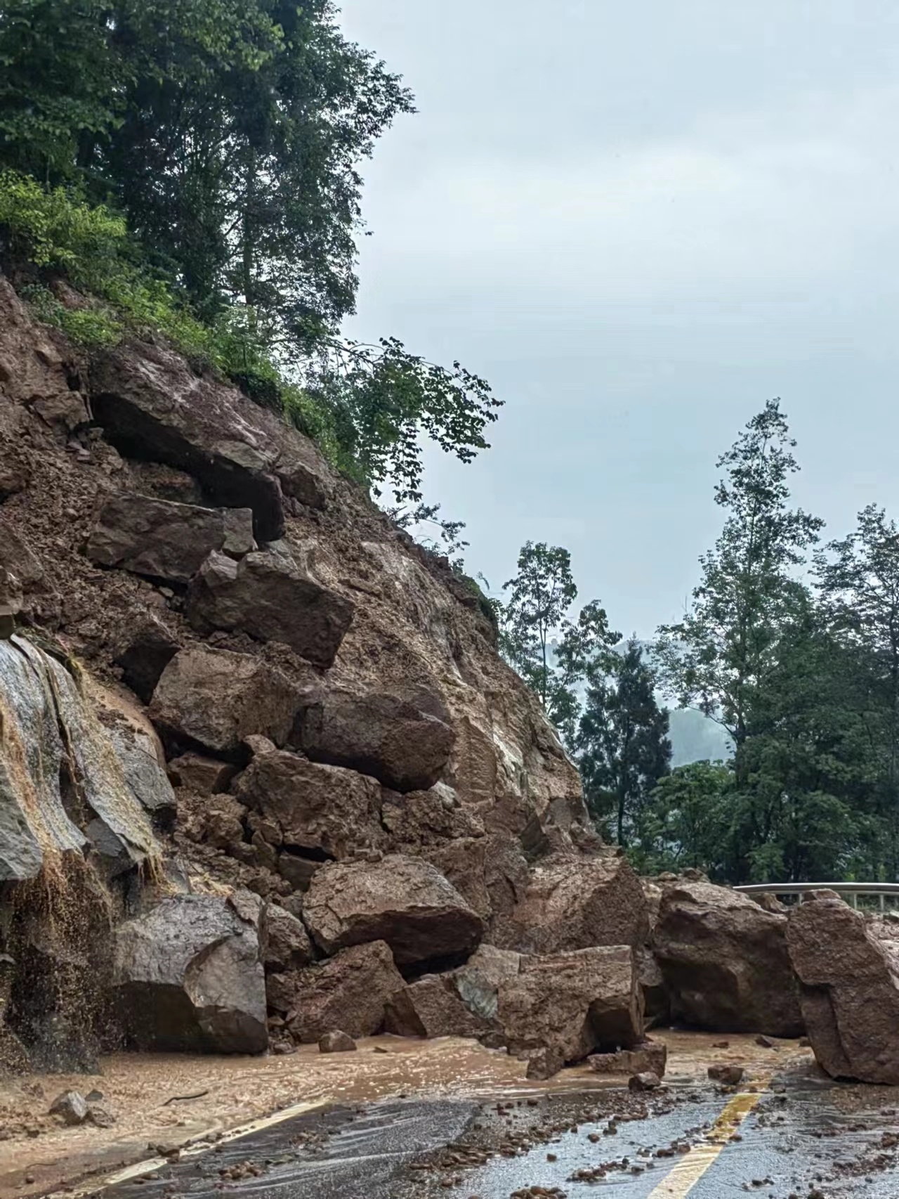 图为旺苍县九龙镇因强降雨道路交通受损现场。