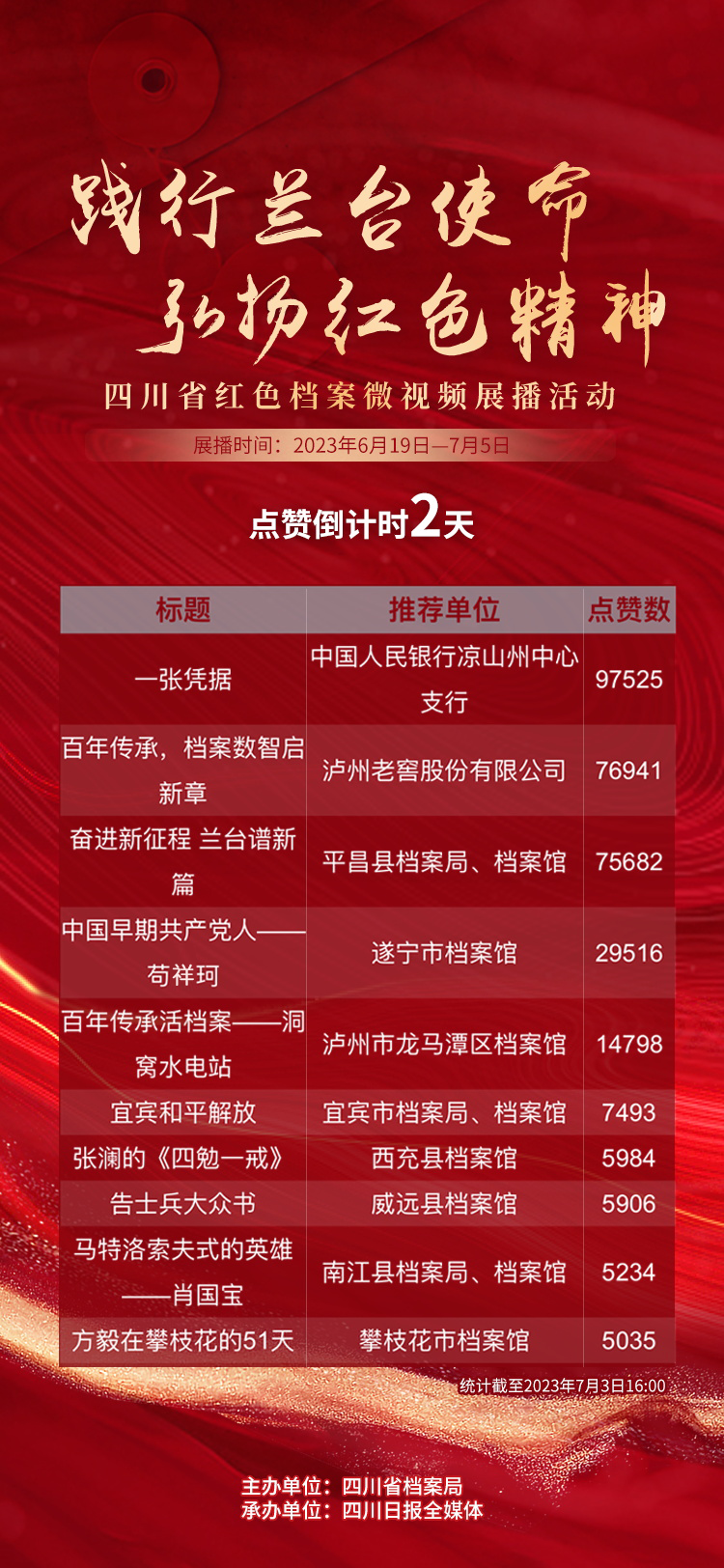 展播活动还有最后两天,快来为你喜欢的红色档案微视频点赞!活动结束后,四川省档案局将综合点赞投票数据和组织情况,对优秀作品及其组织单位予以表扬。