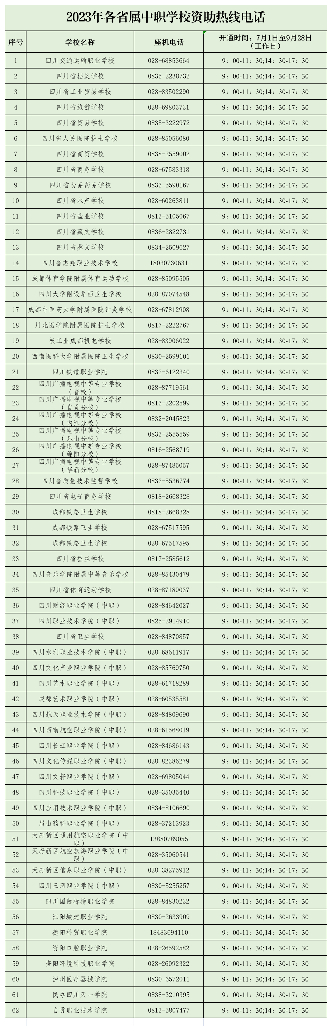 四川省学生资助热线电话:028-86118766(高校科)、028-86121660(中小学科)。受理时段:工作日每天上午9:00-11:30,下午 14:00-17:30。