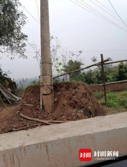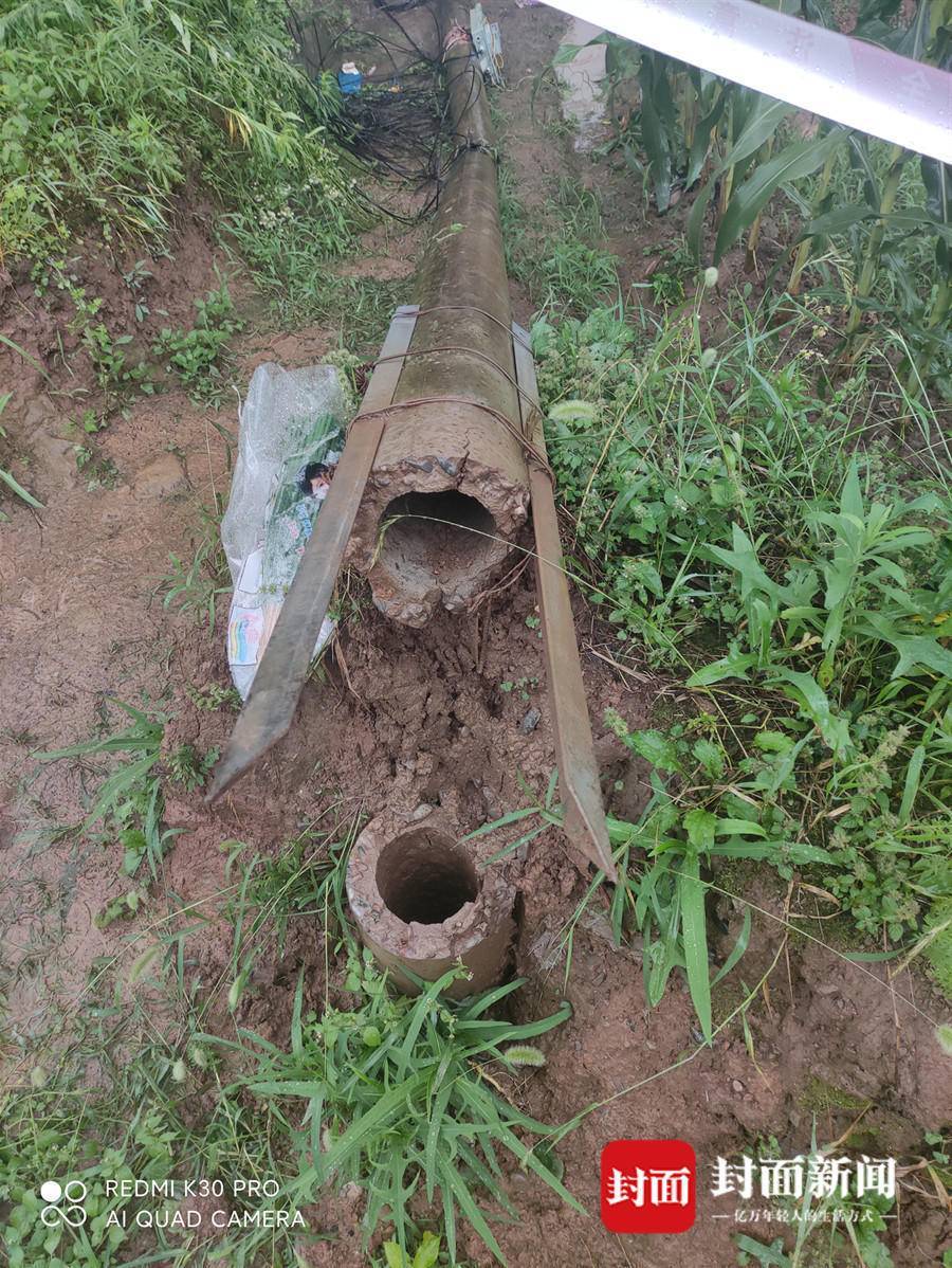 封面新闻记者现场看到,出事的线杆直径十来厘米,现已断为三截,基部已完全断开,从断面看明显系“旧伤”。该断面的一端有三根较长的角钢,被铁丝绑扎在杆身上。
