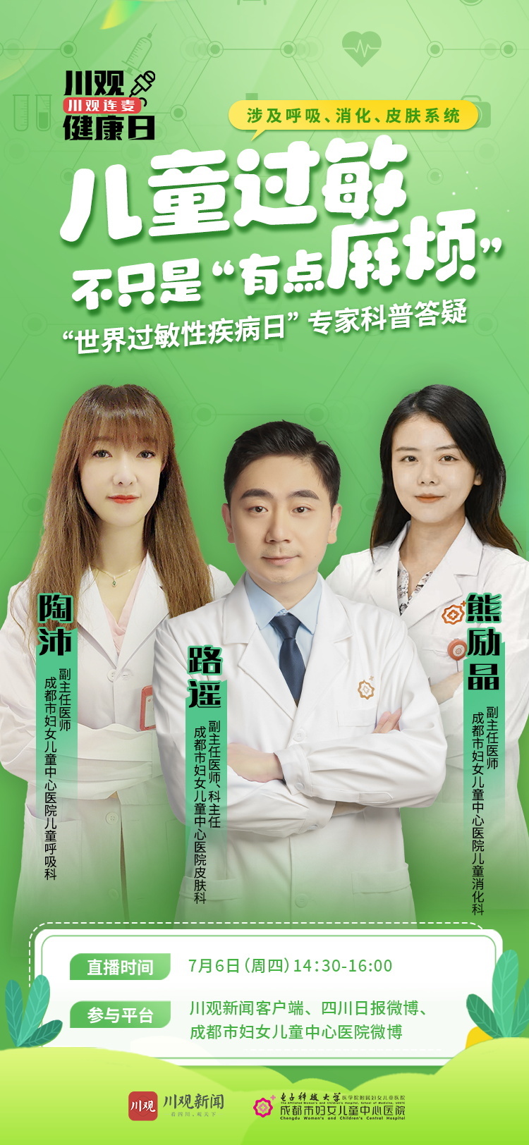 川观新闻携手成都市妇女儿童中心医院开展“川观健康日”连麦直播,儿童呼吸科、儿童消化科、皮肤科的专家们将就儿童过敏的防治等内容进行科普讲解,答疑解惑,帮助过敏儿童及其家庭合理有效减轻过敏困扰。